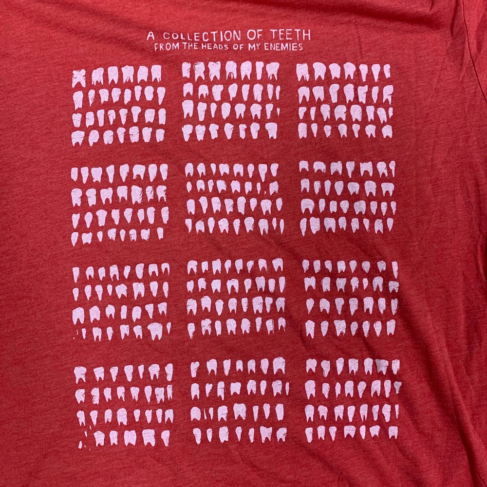 A ONE-TIME ONLY very limited edition RED VARIANT of Ben Chlapek & Landland "A Collection of Teeth from the Heads of My Enemies" T-Shirts, made specifically for Mondocon