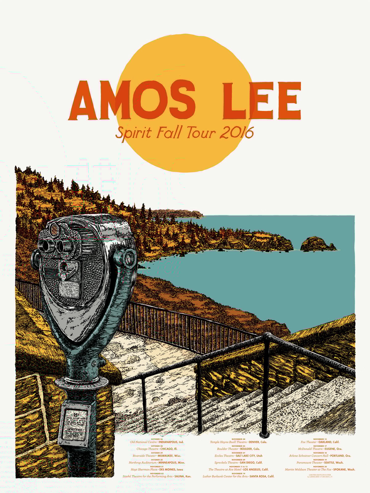 Amos Lee October 26th–November 20th, 2016 United States Tour Info: Four-color screenprint on 100# Cougar Natural cover stock • 18" x 24" Signed & Numbered Artist Edition of 78 Illustration/Design: Dan Black