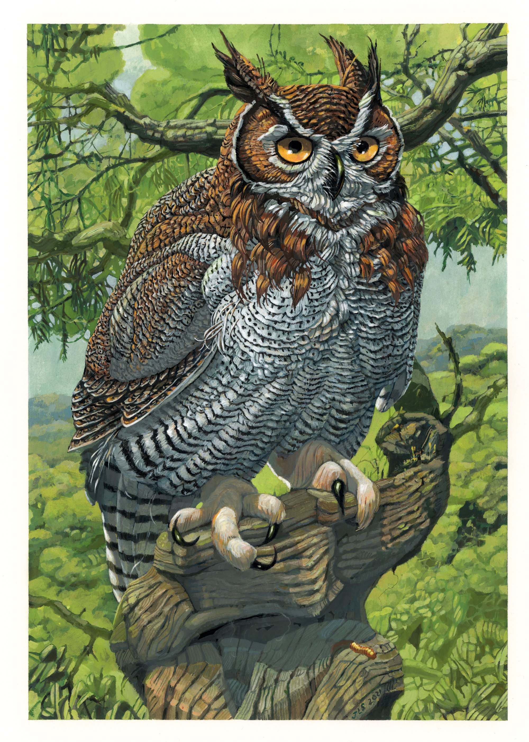 An art print titled "Great Horned Owl"