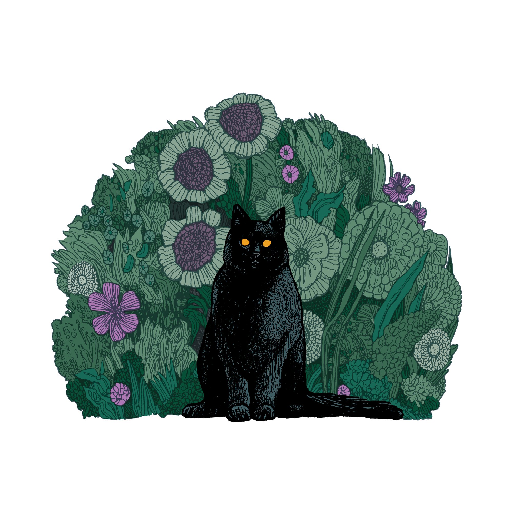An art print titled "Grebe, with Flowers" created by Jes in loving memory of her dearly departed cat Grebe.