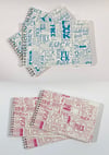 Details: 40 Blank Sheets • 80 pages of 70# text weight French paper • 5.5" x 8" • Assembled in-house, by hand, with test print covers and metal coil binding • Features a small pocket in the back for postcards or loose scraps of paper or nothing or important receipts or gross hair clippings or other things.